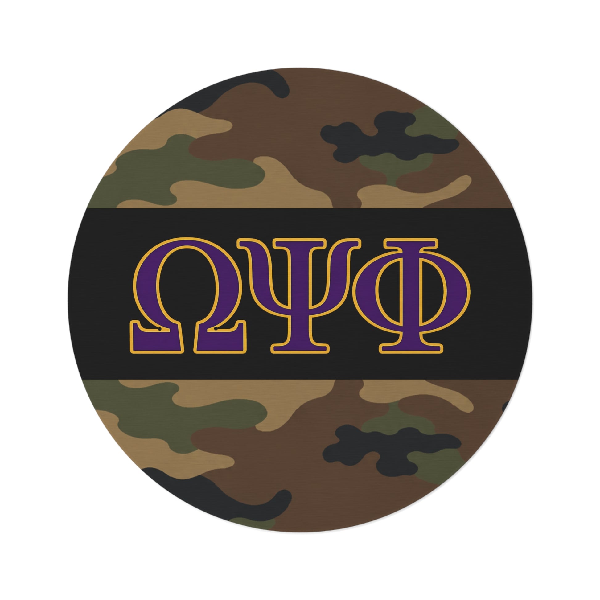 Step into the legacy of brotherhood and excellence with this Omega Psi Phi Camo Round Rug, designed in the striking camouflage, black, purple and gold colors that represent strength, achievement, and timeless Que tradition.